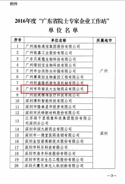 为贯彻落实《中共广东省委 广东省人民政府关于加强新时期科协工作的意见》(粤发[2013]2号)精神,充分发挥科协系统的组织网络、人才智力和科学技术优势,进一步加快实施创新驱动发展战略,将院士、专家等高端人才引入企业,帮助企业解决技术难题,培养科技创新人才,促进产学研合作,提高企业核心竞争力,依据《广东省“院士专家企业工作站”管理办法(试行)》的规定,经有关单位申请、地方科协推荐、实地考察调研,省科协决定在广州市华南农大生物药品有限公司等44家单位建立“广东省院士专家企业工作站”。建站期为2016年12月至2019年12月。