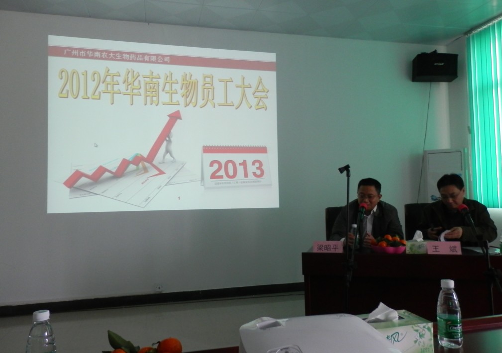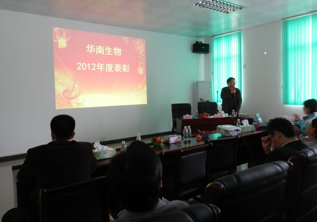 1月24日,华南生物2012年员工大会在办公楼一楼会议室顺利召开。王斌副总经理主持了本次会议,梁昭平总经理在会议上汇报了2012年度公司的经营情况、主要亮点工作及主要完成工作内容。梁总在现场讲话中,感谢全体员工一年来对公司所做出的积极付出,充分肯定了华南生物员工在2012年里所取得的优异成绩,并为企业描绘发展蓝图,鼓励大家共同努力,取得新的辉煌。在肯定上一年度工作成绩的同时,提出了企业在发展上存在的问题与改进办法,展望未来一年的方向和目标,对新一年寄予了热切的期盼。