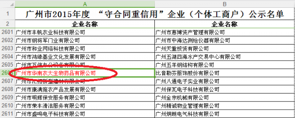 根据广东省工商行政管理局《关于印发广东省守合同重信用企业公示活动规则的通知》(粤工商市字〔2009〕697号)和广州市工商行政管理局《关于守合同重信用公示活动有关问题的通知》(穗工商合〔2013〕209号)精神,经广州各行业协(商)会推荐,并征求各有关部门的意见,认为广州市华南农大生物药品有限公司符合广州市2015年度 “守合同重信用”公示条件。
