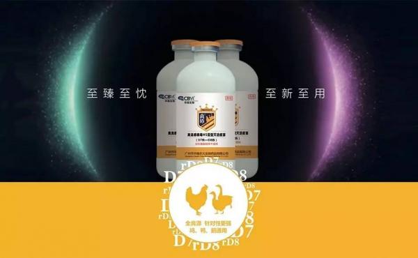 禽流感病毒H5亚型灭活疫苗(D7株+rD8株)“禽盾”适用于水禽和家禽,是针对多分支的H5亚型禽流感的二价灭活疫苗,于2017年3月获得农业部新兽药注册证书【(2017)新兽药证字10号】。该产品选用D7株和rD8株作为疫苗毒株,其中D7株是华南农业大学廖明教授团队于2007年广东发病鸭群分离,为H5和H9天然重组而产生的天然野毒株,对不同时期的Clade2.3.2均有良好的保护力,对水禽保护效果良好;rD8株为重组病毒,是以D7株为骨架,选用目前流行的H5N1亚型禽流感病毒CG1株(Clade 2.3.4.4)作为HA基因供体利用反向遗传技术获得,为全禽源禽流感病毒,具有高效的鸡胚增殖能力,以及良好的家禽免疫良性。针对目前国内流行的Clade 2.3.4.4和Clade 2.3.2.1分支的H5亚型禽流感病毒,产品的抗原性可以实现全覆盖,具有良好的交叉保护作用,对鸡和水禽均有良好的安全性和免疫效力。经过多次临床试验证明,禽流感病毒H5亚型灭活疫苗(D7株+rD8株)可有效预防家禽感染H5亚型禽流感。