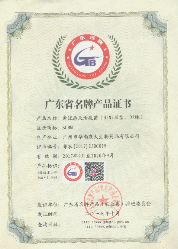 为贯彻落实广东省委、省政府关于实施名牌带动战略的重要部署,不断提高广东省农产品质量和市场竞争力,根据《广东省名牌带动战略实施方案》和《广东省名牌产品(农业类)管理办法》,经广东省南方名牌农产品推进中心组织专家评审和广东省名牌产品(农业类)推进委员会审核,广州市华南农大生物药品有限公司产品获得“广东省名牌产品”称号,此次共评出2017年广东省名牌产品(农业类)453个,其中初评产品212个,到期复审产品241个。
