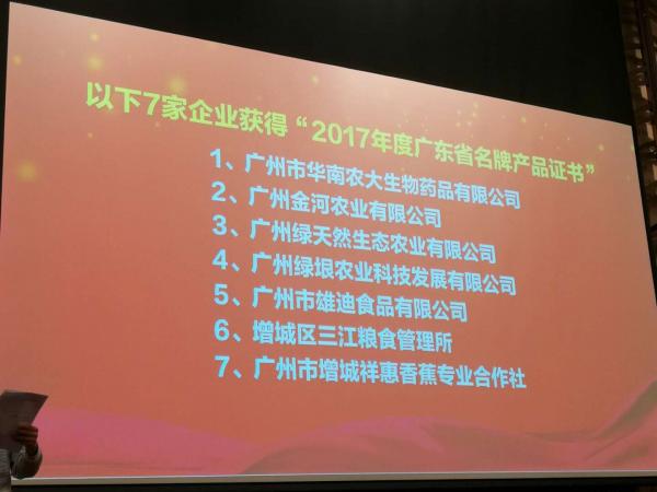 为提高广东省名牌产品(农业类)的知名度,鼓励农业企业争创名牌,做大做强我省农业品牌,广东省农业厅决定在全省范围内对获得2017年广东省名牌产品(农业类)的生产企业予以通报表彰,并颁发“广东省名牌产品”证书。2018年1月25日,广州市增城区农业企业协会召开以“产融对接、助推农企,不忘初心、服务会员”为主题的2017年年会暨省名牌产品颁牌仪式,广州市增城区获得“2017年度广东省名牌产品”证书的企业有7家。