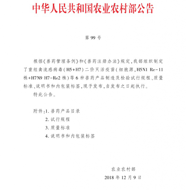 信息来源:中华人民共和国农业农村部公告 第99号http://www.moa.gov.cn/govpublic/SYJ/201812/t20181213_6164848.htm