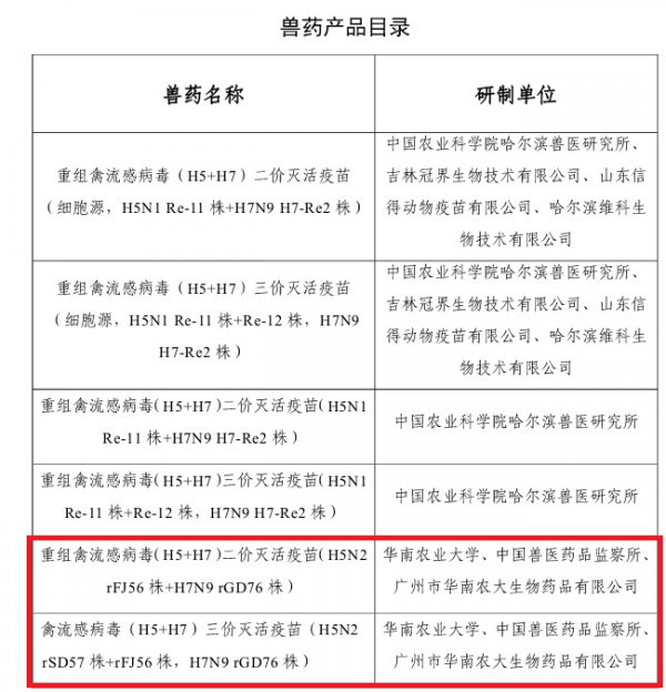 热烈祝贺华南农业大学、中国兽医药品监察所与广州市华南农大生物药品有限公司联合研制的重组禽流感病毒(H5+H7)二价灭活疫苗(H5N2 rFJ56株+H7N9 rGD76株)和重组禽流感病毒(H5+H7)三价灭活疫苗(H5N2 rSD57株+rFJ56株,H7N9 rGD76株)两个产品通过农业农村部新兽药评价!!!