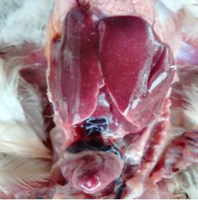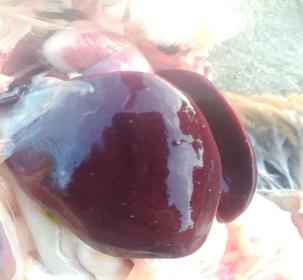 本场爆发的鸡霍乱病例中多为急性病例,鸡群并未见明显的临床症状,多数鸡突然死亡。少部分鸡精神倦怠、离群呆立,少见甩头症状。病鸡排黄绿色稀粪,呼吸加快。体重较大的鸡死亡率较高,剖检可见鼻腔有泡沫状粘液,鸡冠苍白水肿;气管有卡他性渗。心脏脂肪和外膜出血,肝脏有明显的白色坏死点;十二指肠粘膜红肿。肝脏病变见下图: