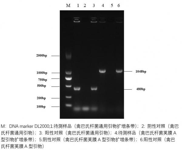 用荚膜分型引物进行PCR扩增,结果显示为A型多杀巴氏杆菌阳性。凝胶图片如下: