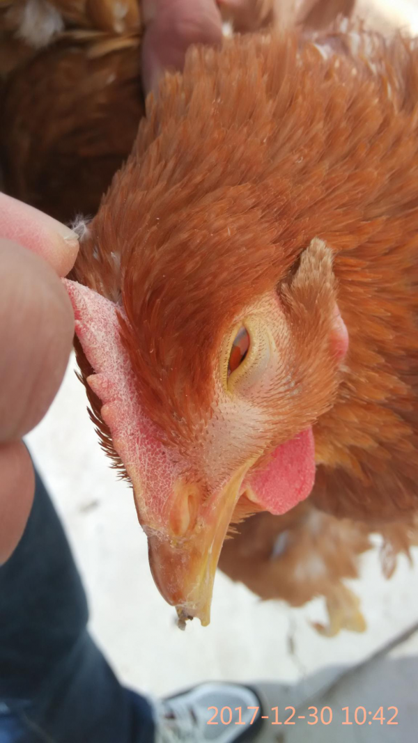 IC在鸡育成阶段和产蛋阶段高发,各个品种鸡对Apg都易感,尤其是8-16周龄阶段育成及产蛋鸡群。老龄鸡感染较为严重。发病初期主要表现为采食量和饮水量轻微下降,打喷嚏,流出的鼻液先为清亮色,三到四天后转为白色脓性鼻涕,并伴着流泪,眼肿大,严重时整个头部肿大,眼睛内陷,部分蛋鸡眼睛失明。IC的一个特征是潜伏期短,接种培养物或分泌物后24-48h内即可发病。
