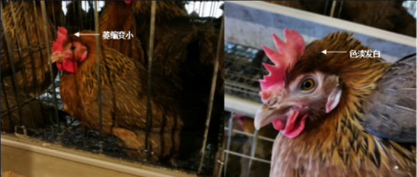 正常开产的成熟鸡群鸡冠、肉髯应该丰满挺立,红润温暖,感染IBV后出现异常的鸡群会观察到有部分鸡的鸡冠、肉髯萎缩变小、色淡发白,用手触摸感觉冰凉。
