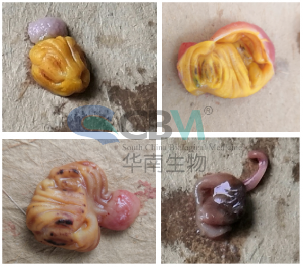 股骨头坏死,股骨头软骨易脱落;嗉囊白色假膜样粘附物,腺胃肿大,肌胃角质层增厚、易裂开脱落,甚至出现明显溃疡灶;一日龄弱雏或出壳不全鸡雏肌胃呈点状、线状、片状溃疡;毛蛋和严重呼吸道症状雏鸡的肺、气囊中出现霉菌结节。