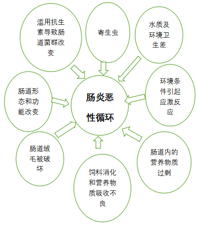 影响家禽肠道健康的传染源有细菌和寄生虫,水质,日粮中的应激因子(毒素)或其他因素等。大量抗生素的使用是导致家禽菌群失调,也是导致家禽患有坏死性肠炎和细菌性肠炎频发。
