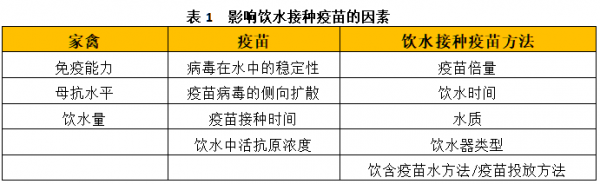 饮水接种疫苗的原则是向所有的家禽至少提供最小保护剂量的活疫苗,同时需防止现场野毒在家禽中扩散。因此,饮水接种疫苗的效果取决于多种与保持疫苗活性相关的因素、饮水接种操作方法和家禽健康情况三大类。具体见表1所示,忽略一个小细节,都有可能致使疫苗免疫失败。