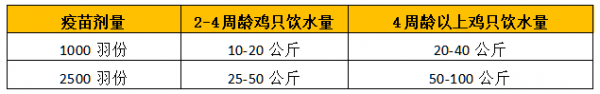 溶解疫苗所需的水量根据鸡群日饮水量而定,大致的标准是:全天饮水量的1/5-2/5,如果是考虑肉鸡或天气炎热时,饮水量可增加5~10%(参考下表)