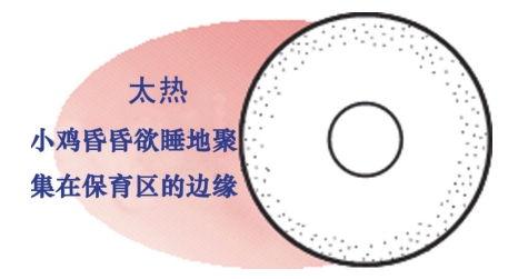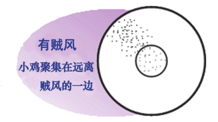 (3)鸡舍内的温度要保持均衡和稳定,避免温度忽高忽低和鸡舍两端温差过大,检查温度是否合适的最佳方法,是观察鸡苗的分布状态及活动表现(如下图,中间小圆圈为加热器)。