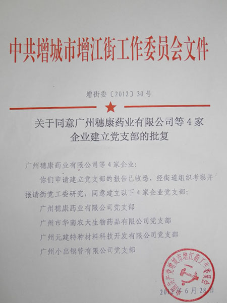 增江街党工委相关领导在2012年7月2日莅临我司进行揭牌仪式,宣告广州市华南农大生物药品有限公司党支部正式成立。