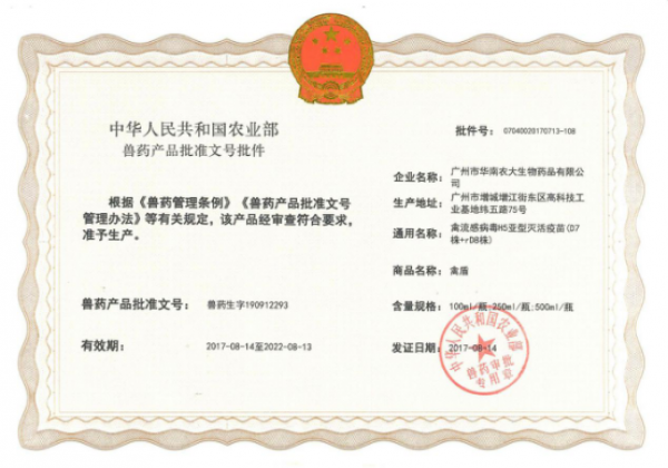 2017年8月14日,由华南农业大学、中国兽医药品监察所、广州市华南农大生物药品有限公司(以下简称“华南生物”)共同研发的禽流感病毒H5亚型灭活疫苗(D7株+rD8株)通过农业部兽药产品批准文号的审批,喜获得农业部核发的兽药产品批准文号——兽药生字190912293;商品名:禽盾。