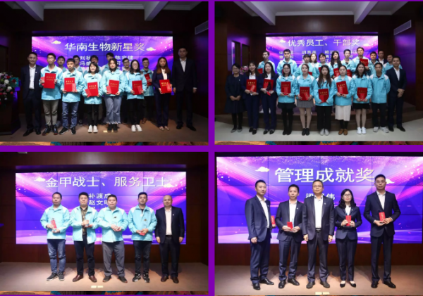2019年,涌现出一批批表现优秀的管理人员、基层人员与团队进行了表彰颁奖。现场颁发的奖项依次是:华南生物新星奖、优秀员工奖、优秀干部奖、服务卫士奖、金甲卫士奖、管理成就奖、管理卓越奖、优秀专家奖、最佳支持团队奖、攻坚克难团队奖、最佳保质保量团队奖、王者之师团队奖。