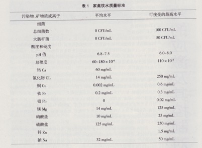 水对养分的消化、吸收、转运和废物排泄有着重要的作用。水是廉价、容易得到,也是容易被忽略的重要养分。在大生产中通常会注意给水的数量,即会经常检查饮水乳头的好坏,却容易忽视饮水的质量。实际上在生产中经常遇到的鸡群生产成绩不正常,易患卵黄性腹膜炎及其他疾病,这种情况通常与饮水质量有关。表1列出了家禽饮水质量的相关标准,在生产中重视饮水质量会给种鸡生产带来事半功倍的效果。