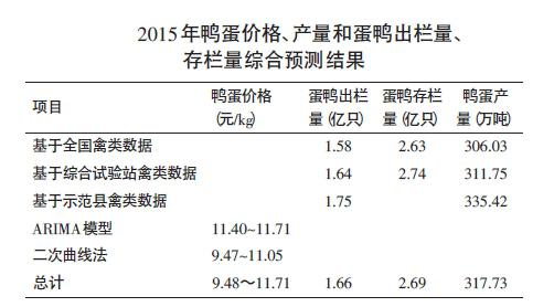 基于三种数据来源(全国禽类数据、12个蛋鸭主产省区禽类数据和示范县禽类数据)采用比例调整法对蛋鸭出栏量和鸭蛋产量进行了推算,预测出2015 年蛋鸭出栏量为1.66亿只,与2013年相比增加20.29%,产蛋量为317.73万吨,与2013年相比略有下降,下降幅度为5.92%;基于两种数据来源(全国禽类数据、12个蛋鸭主产省份禽类数据)对蛋鸭存栏量进行了预测,预测出2015年蛋鸭存栏量为2.69亿只,与2013年相比增加39.38%;采取两种方法(ARIMA模型和二次曲线法)对鸭蛋价格进行了预测,根据两者预测结果汇总得出,2014年底至2015年初,每千克鸭蛋价格将维持在9.47元~11.71元之间,在节假日会有小幅上涨,与2013年相比基本无变化。