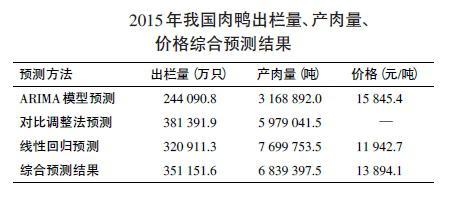 由于2013年受人感染H7N9流感事件的冲击而价格和生产量均有所下降,进入2014年一直处于反弹增长趋势,而且这一趋势还会在2015年持续一段时期,因此,根据3种预测方法综合预测:2015年肉鸭的出栏量为35.1152亿只,较2013年增长14.55%;产肉量683.94万吨,较2013年增长9.02%;白条鸭价格为13 894.1 元/吨,较2013年增长5.82%,在11 942.7~15 845.4元/吨波动。根据预测结果分析,2015年肉鸭产业将呈现平稳增长的态势。