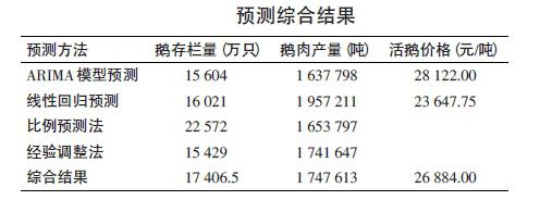 采用4种方法预测2014年鹅存栏量、鹅肉产量,以及2种方法预测2014年的活鹅价格(见表)。根据4种方法计算出的2014年鹅存栏量的平均值为17 406.5万只,鹅肉产量为1747 613吨,鹅价格为26 884元/吨。另外,参照扬州大学徐琪根据我国鹅品种统计的鹅年存栏量21195万只,可以估算出2014 年我国鹅年存栏量将处在1.7亿~2.1亿只之间。因此,上述综合预测结果是可信的。
