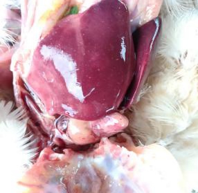 本场爆发的鸡霍乱病例中多为急性病例,鸡群并未见明显的临床症状,多数鸡突然死亡。少部分鸡精神倦怠、离群呆立,少见甩头症状。病鸡排黄绿色稀粪,呼吸加快。体重较大的鸡死亡率较高,剖检可见鼻腔有泡沫状粘液,鸡冠苍白水肿;气管有卡他性渗。心脏脂肪和外膜出血,肝脏有明显的白色坏死点;十二指肠粘膜红肿。肝脏病变见下图: