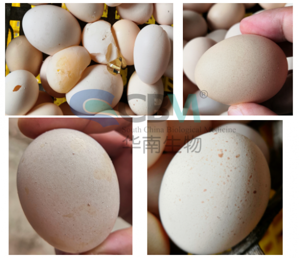 患鸡吐口水,拉饲料便,逐渐消瘦;产蛋率下降,种蛋受精率下降,孵化后期(18天龄)死胚增多,孵出弱雏增多,死亡增多;种蛋大小不一,蛋壳质量变差,破壳蛋、软壳蛋增多,血斑蛋、霉斑蛋增多。