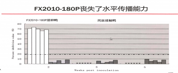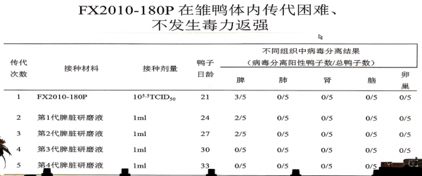 疫苗毒通过传代致弱,无致病性。免疫后同居鸭群未受感染,且无法在体内传代。说明其无水平传播能力,无毒力返强风险。