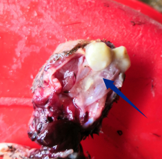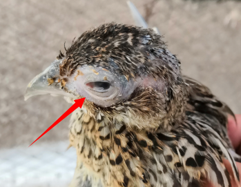 2、鼻孔先流出清液后转为浆液粘性分泌物,有时打喷嚏。脸部、肉髯肿胀,呼吸困难,口鼻喉有粘液。