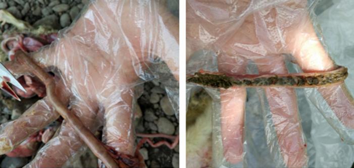 典型的小鹅瘟“腊肠样”栓塞病变