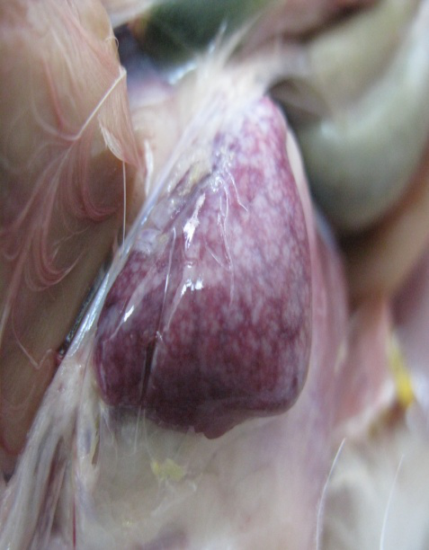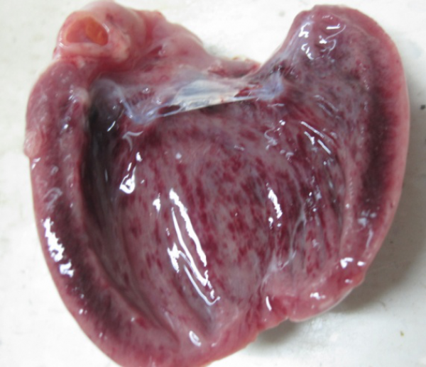 心内外膜出血;脑膜水肿、出血;肺脏先是一侧出血发黑,后两侧出血发黑;肝脏肿大,颜色多数发黄发白,类似腺病毒;脾脏肿大、出血,似大理石样花斑;肾脏肿大、出血,似花斑样;有的腺胃乳头出血;胰脏出血。