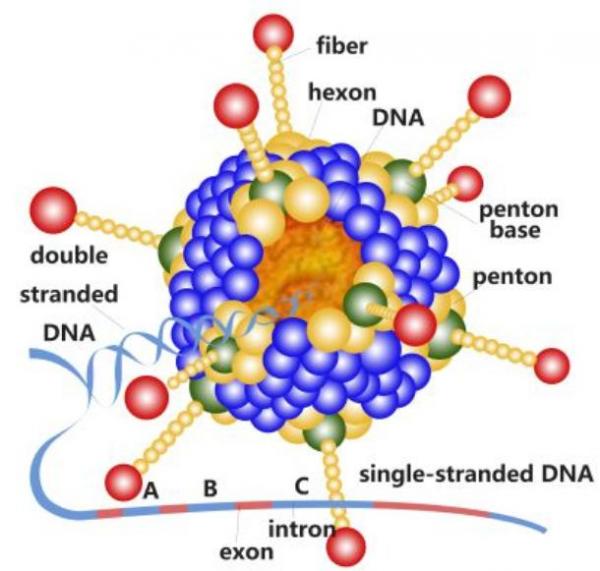 FAdV-Ⅰ为腺病毒科腺病毒属病毒,无囊膜,直径为70-90nm,呈20面体对称结构。表面由252个壳粒组成,包括240个六棱体和12个五棱体,每个五棱体有2条纤维突起。中间包着直径60-65nm的髓蕊(双股DNA和核蛋白),壳粒排列在三角形的面上,每边6个壳粒。禽腺病毒具有2根长度相近的纤丝,纤丝的长度与抗原性有关。