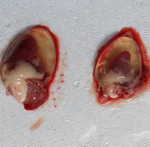 (2)心包积液综合征:剖检病变主要表现为心包腔内有黄色清亮水样或胶冻样液体,心肌柔软,有坏死点。肝脏肿大、质脆易碎、有坏死灶;脾脏肿大;肺水肿、充血等。