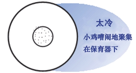 (3)鸡舍内的温度要保持均衡和稳定,避免温度忽高忽低和鸡舍两端温差过大,检查温度是否合适的最佳方法,是观察鸡苗的分布状态及活动表现(如下图,中间小圆圈为加热器)。